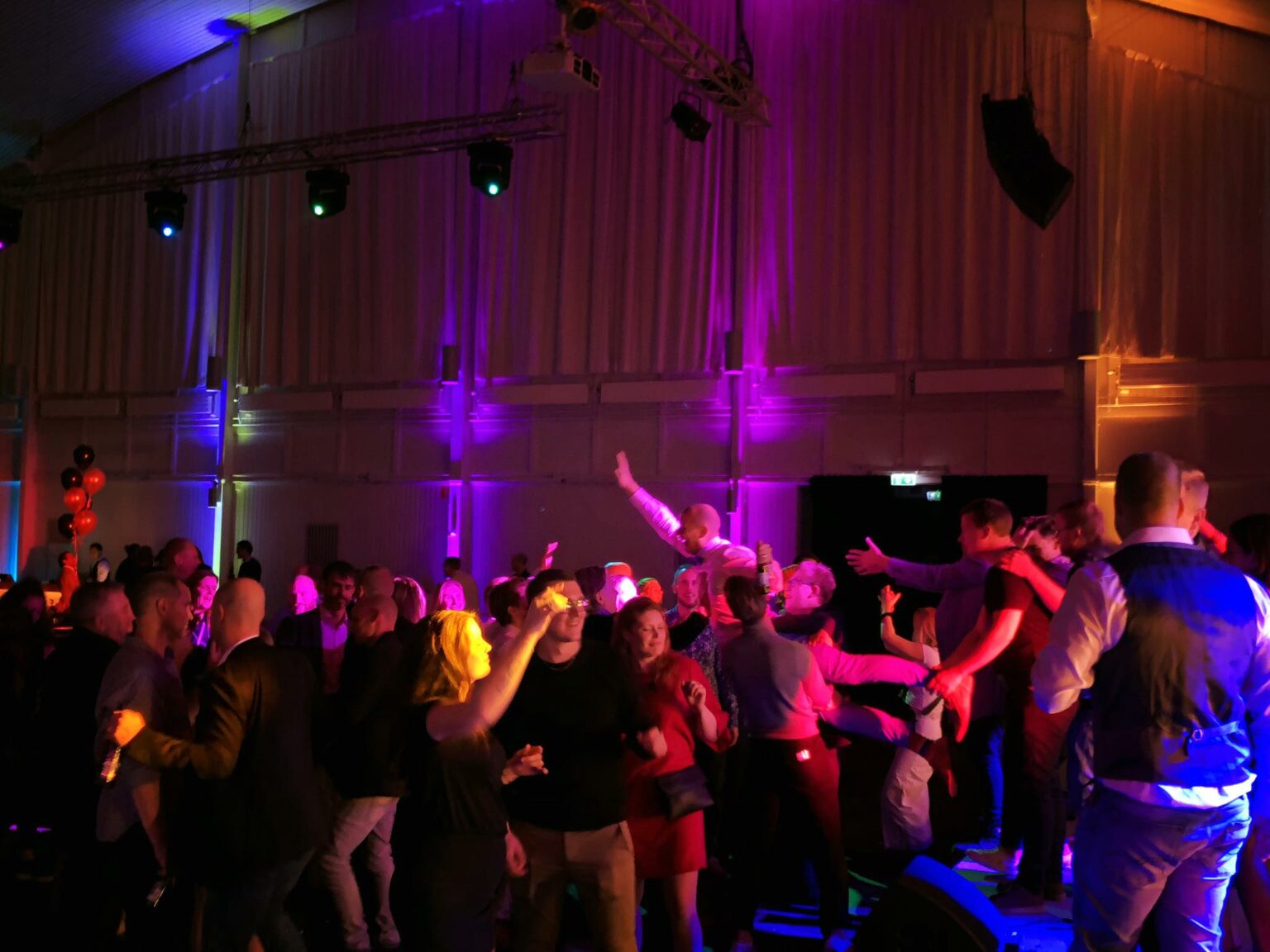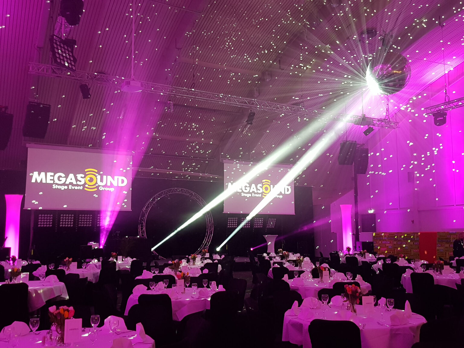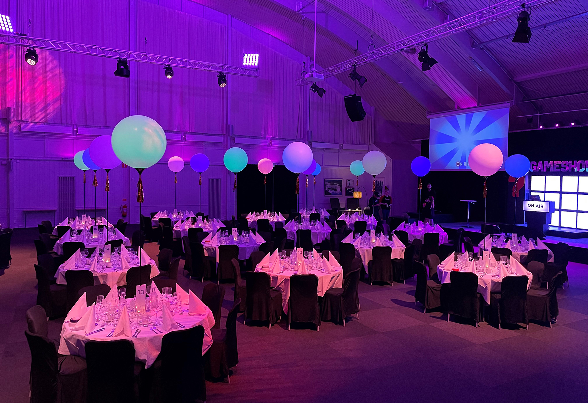 Vår eventlokal rymmer inte bara 380 middagsgäster vid runda bord, här finns även en scen för spex och underhållning till middagen.