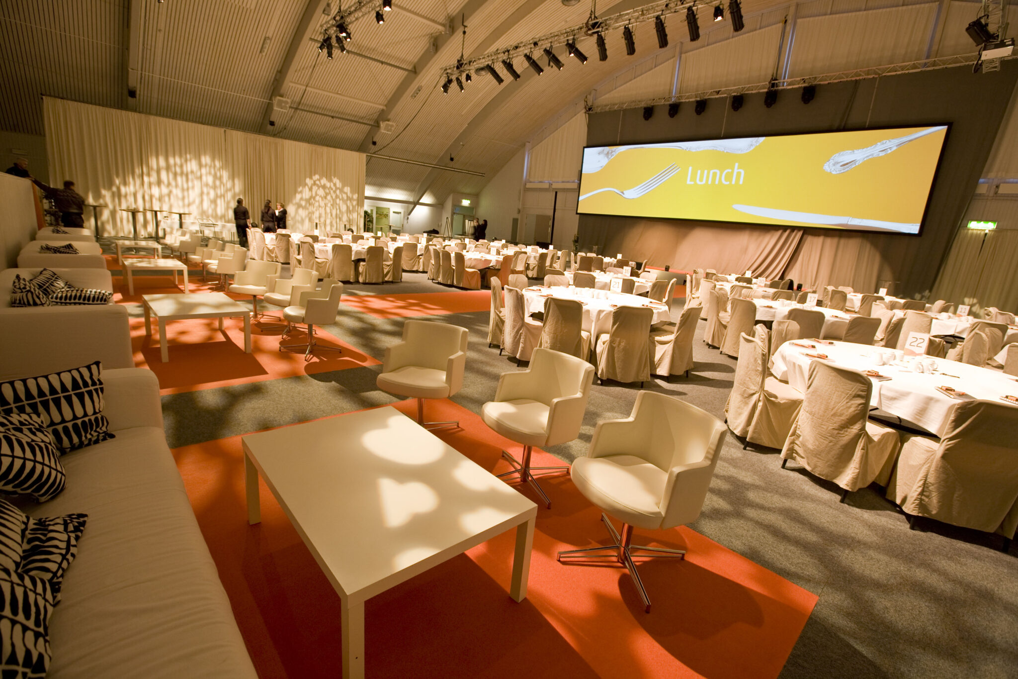 Bord 120×45 cm, 25 runda bord 140 cm ∅, 20 runda bord 150 cm ∅, stolar, 10 st ståbord, 6 st loungesoffor, 4 fåtöljer samt 3 st loungebord.