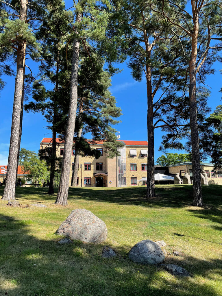 En luftig lokal med stora fönster, utsikt över innegården och mellan träden ser ni vattnet glittra.