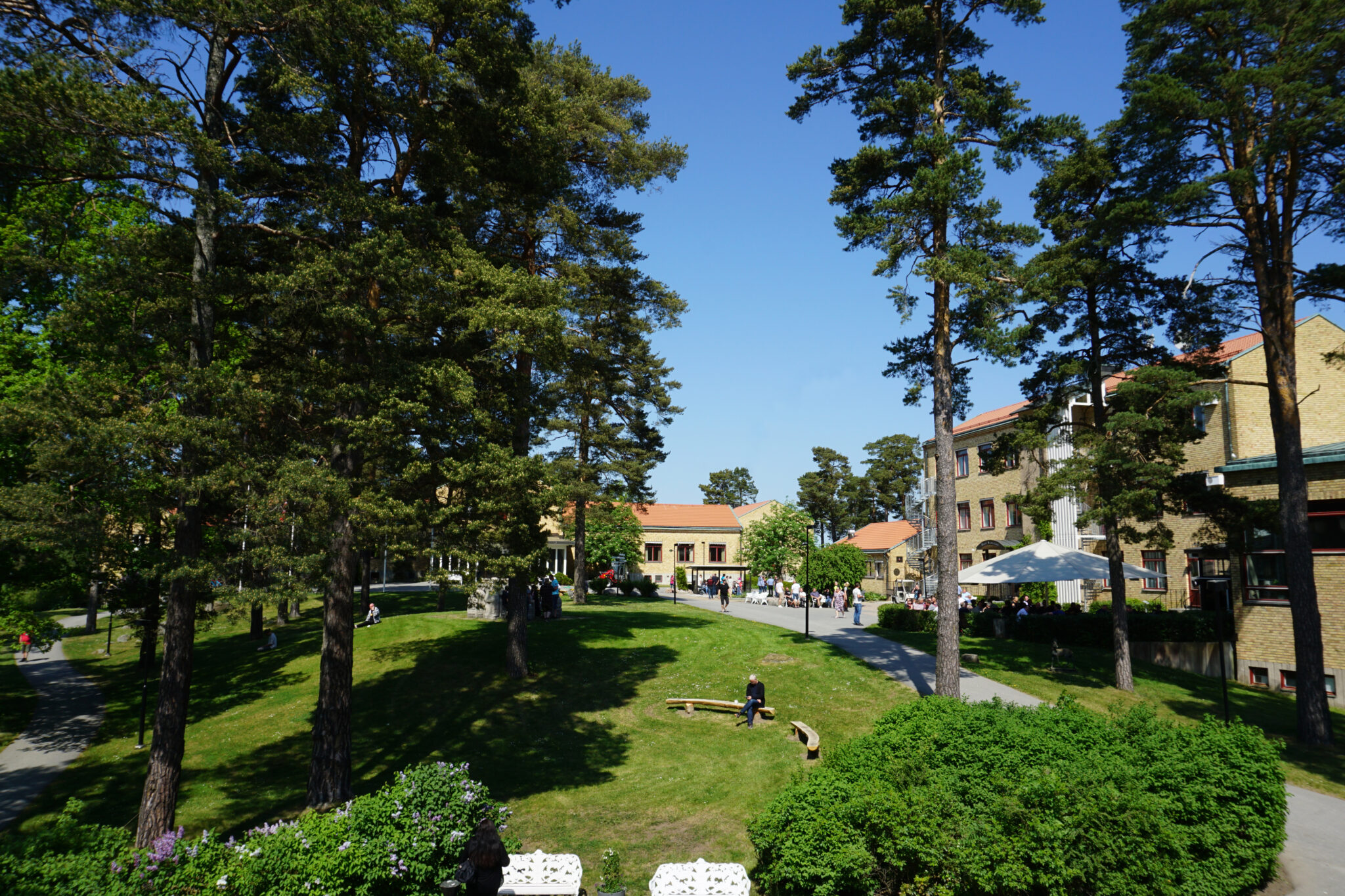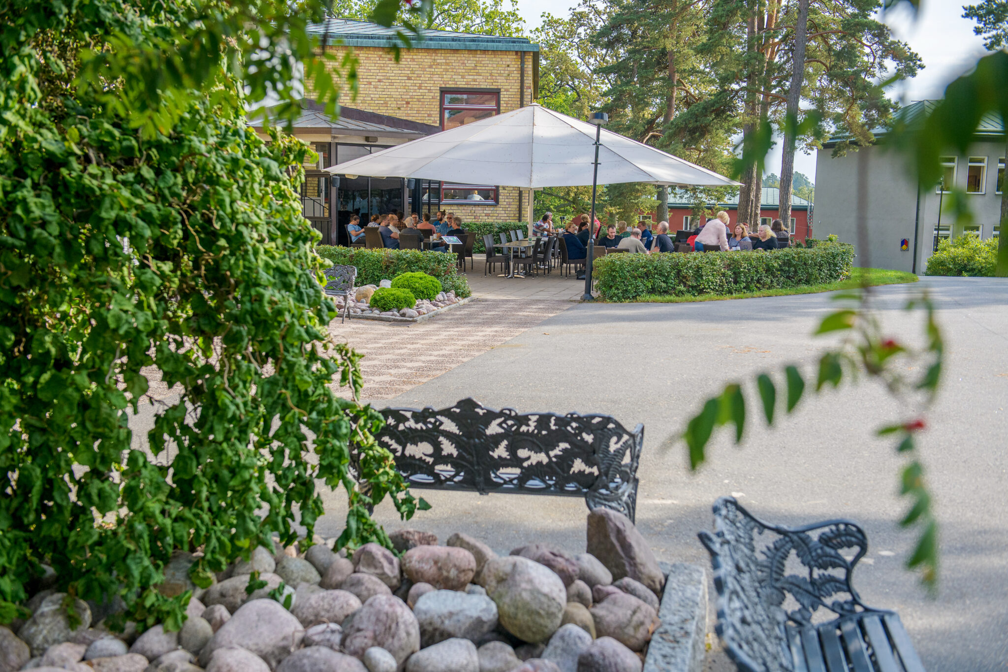 Den inbjudande terrassen är placerad på gården mellan det stora konferenshuset och huvudbyggnaden med café, bar, restaurang och flera konferenslokaler. Här träffar du ofta gäster som grupparbetar, njuter av en kopp kaffe eller drink före maten.