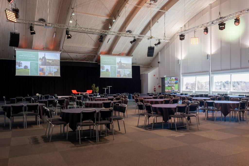 Den stora fönsterväggen i Runöhallen har två varianter av solskydd. Utan mörkläggning bjuder vi på en känsla av att sitta direkt i naturen. Du kan också välja att mörklägga helt eller bara stänga solen ute.