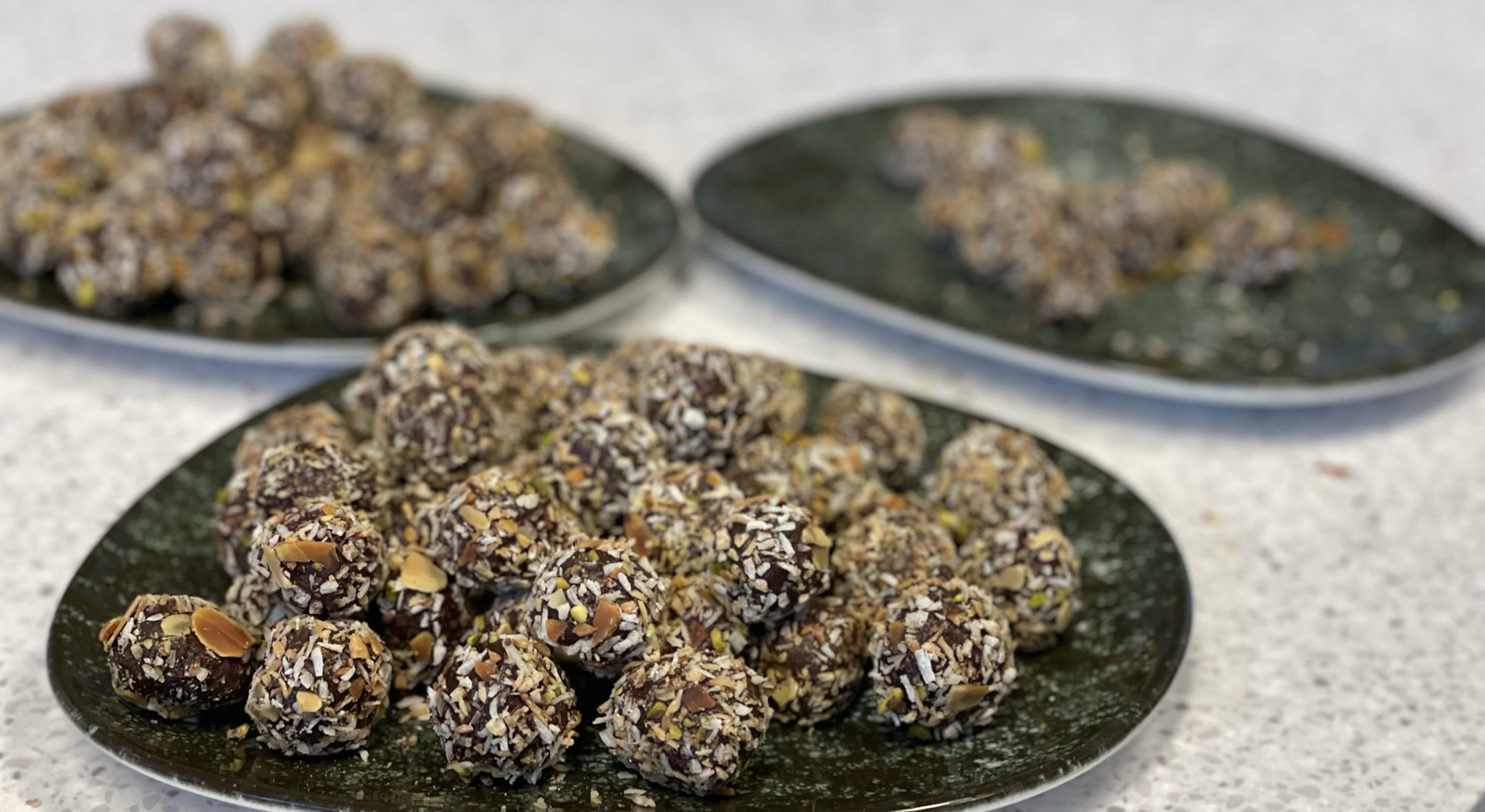 7. Täck dina rawfoodbollar med ett tunt lager choklad och rulla sedan i nöthacket.