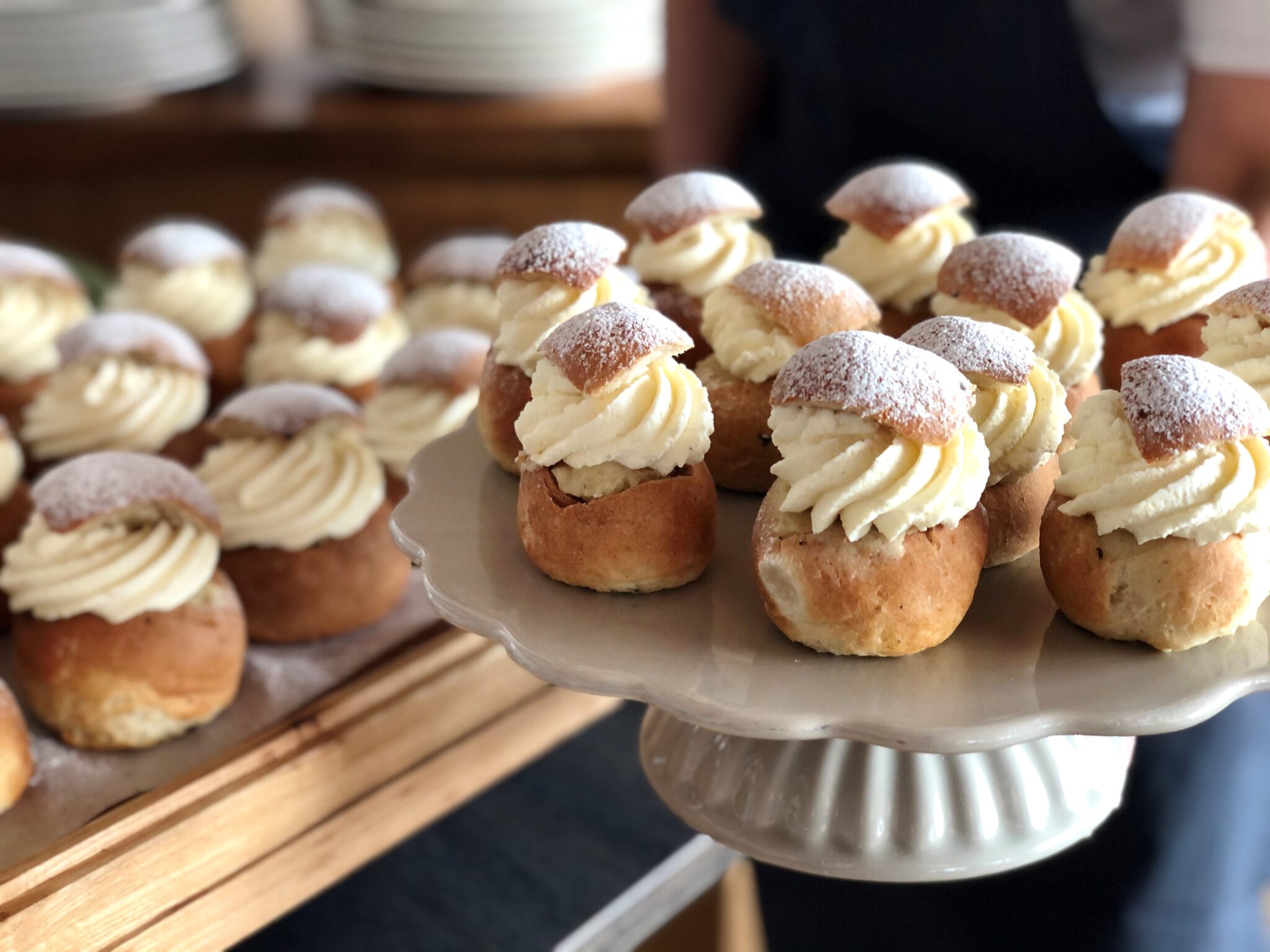 5. Fyll semlan med mandelmassa, spritsa på grädde, lägg på locket och pudra med florsocker.