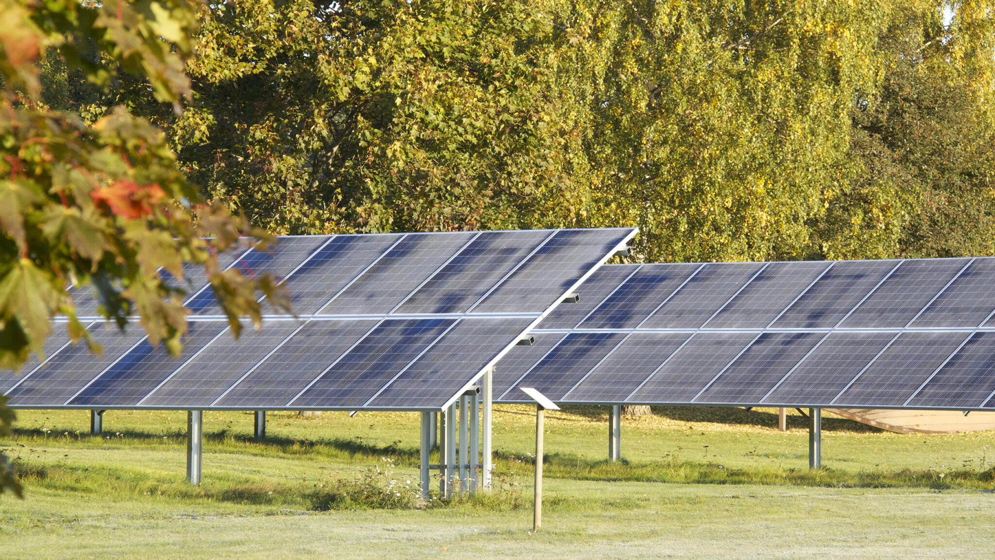 Solpanelerna är markplacerade och står på en gräsyta med jordankare.